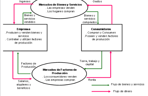 Las familias reciben ingresos de las empresas y el gobierno, compran bienes y servicios de las empresas y pagan impuestos al gobierno. Compran también bienes y servicios de fabricación extranjera(importaciones). Las empresas reciben pagos de las familias y el gobierno a cambio de bienes y servicios; paga salario, dividendos, intereses y alquileres a las familias, e impuestos al gobierno. El gobierno recibe impuestos tanto de las empresas como de las familias , paga tanto a empresas como a familias por bienes y servicios incluidos los salarios a los empleados gubernamentales.